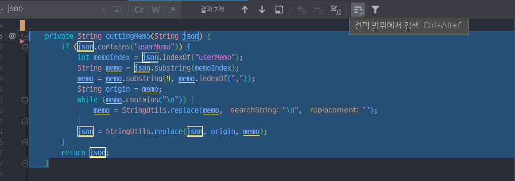2. 이때 Ctrl + Alt + E를 누르거나 이미지의 아이콘을 누르면 현재 선택한 위치에서만 단어를 검색한다.