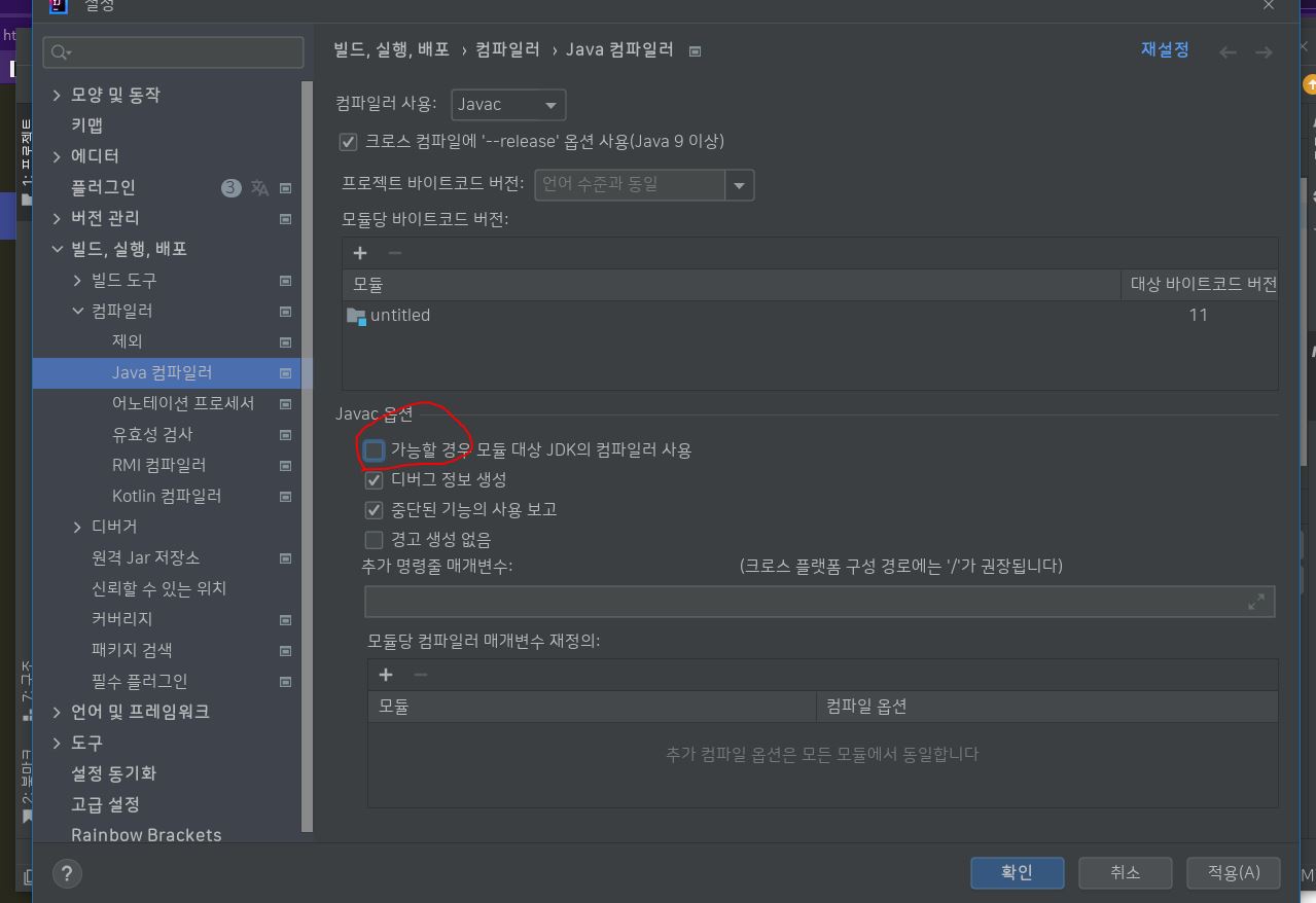 위치 : 파일 | 설정 | 빌드, 실행, 배포 | 컴파일러 | Java 컴파일러