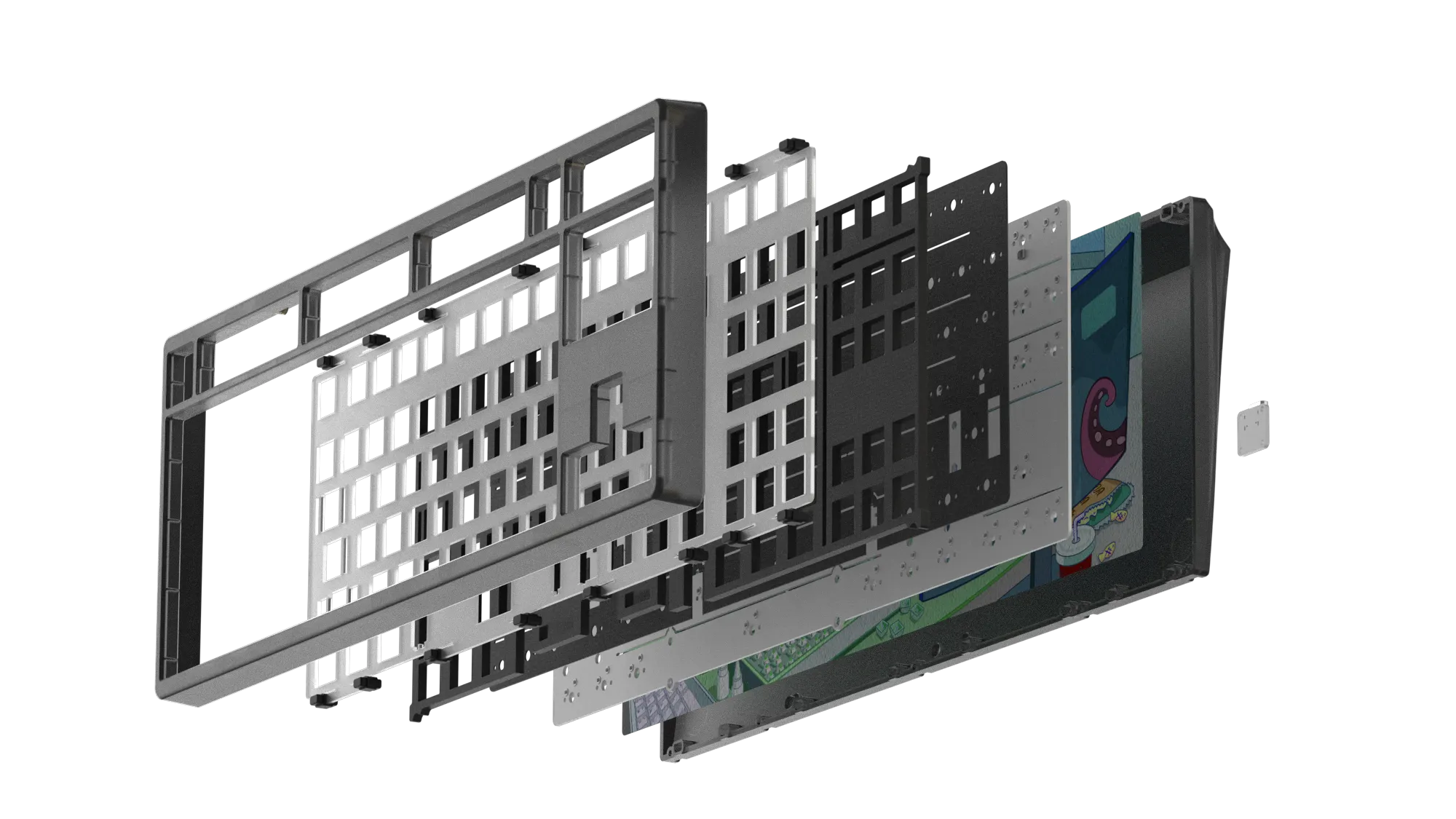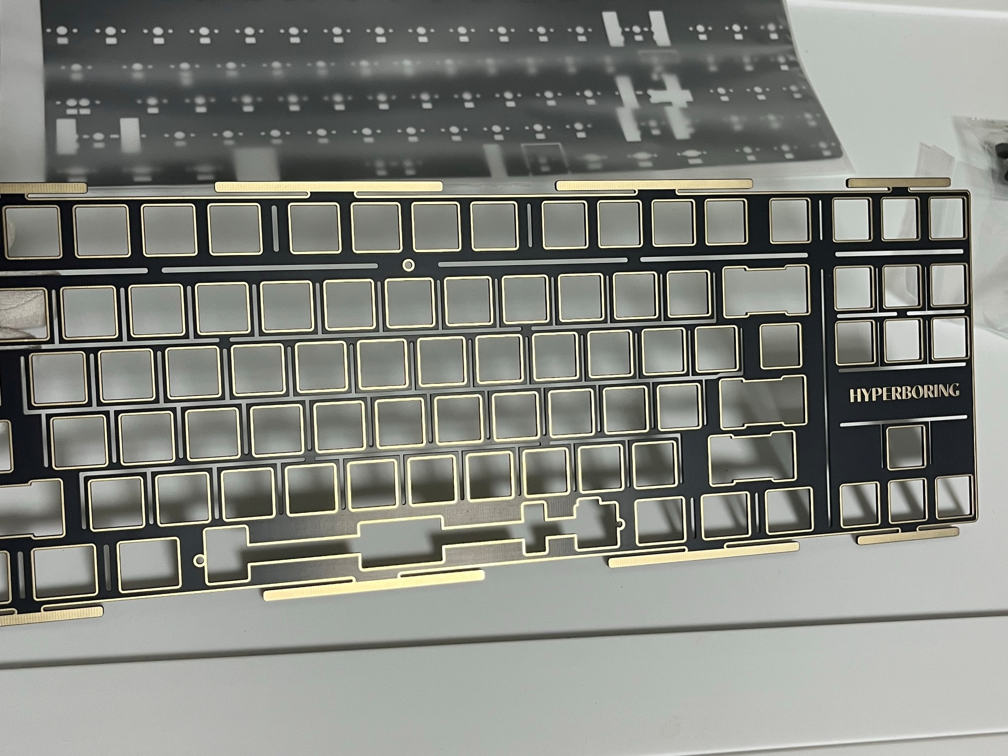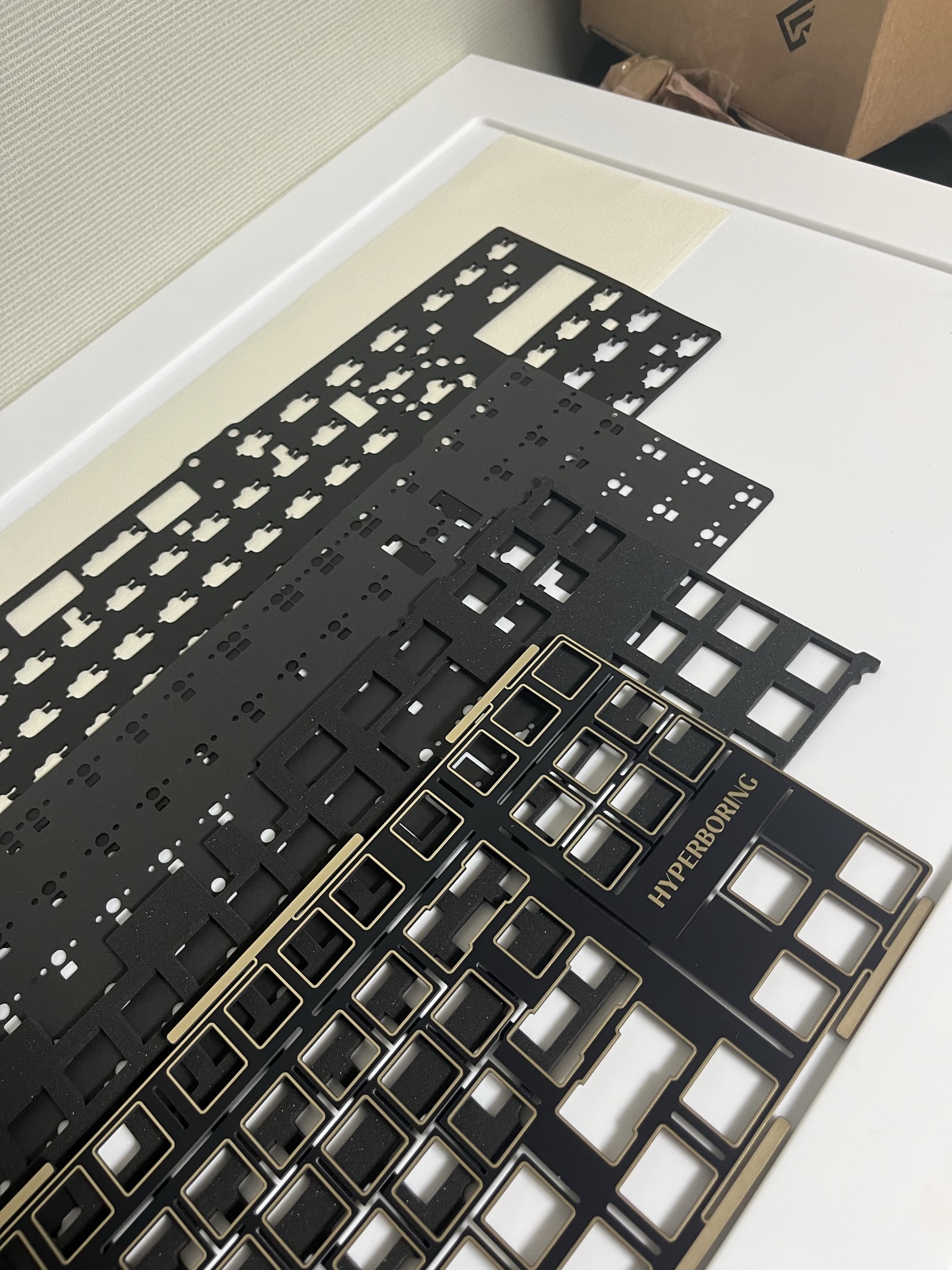 ![]() FR-4 재질의 보강판. 보강판 주제에 이쁘게 만들어져있다. | ![]() 각종 흡음재들. (왼쪽부터)보강판, 기판-보강판 사이 흡음재, 스위치 흡음재, 케이스 흡음재, 종이테이프 |