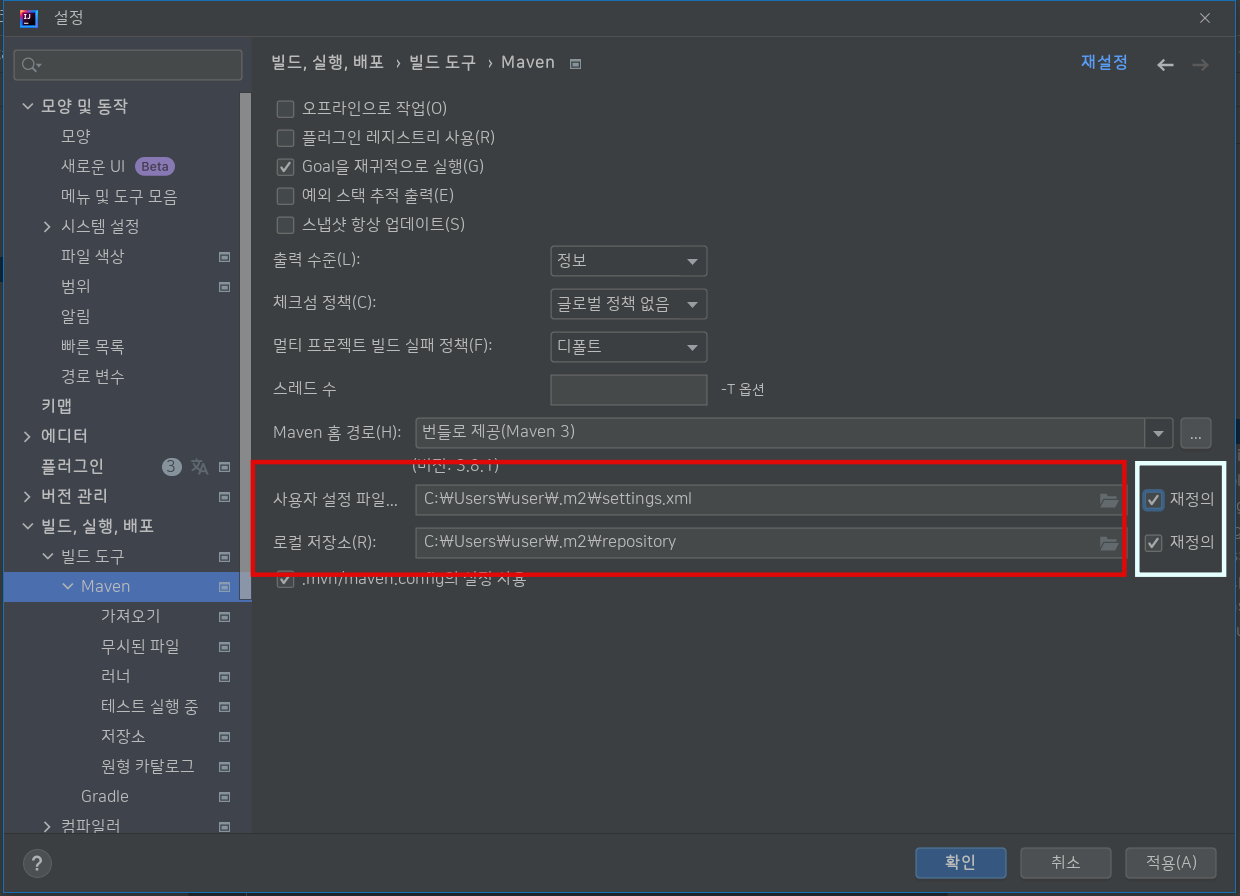 이렇게 하면 로컬상의 메이븐 리포지토리 위치를 제대로 잡아준 것이다.