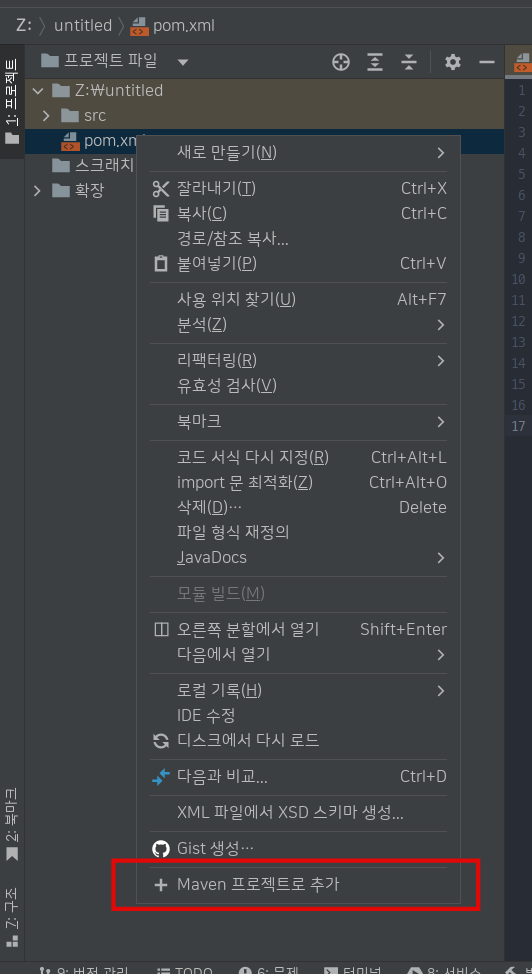 거기서 pom파일을 찾아 우클릭을 해보면 maven 프로젝트로 추가 버튼이 있다. 그걸 해주면 50%은 완료다.