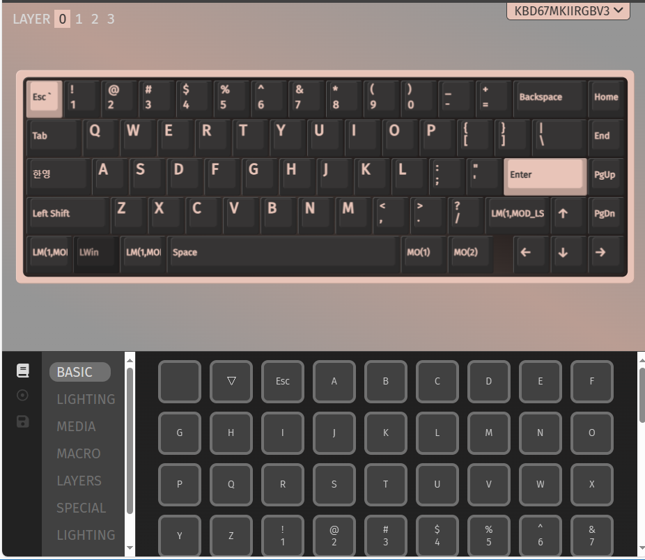 * LM(레이어 번호, mod) : 모디키 쪽으로 확장성을 가지는 명령어다. 일반적으로 누르면 해당 레이어로 동작한다.