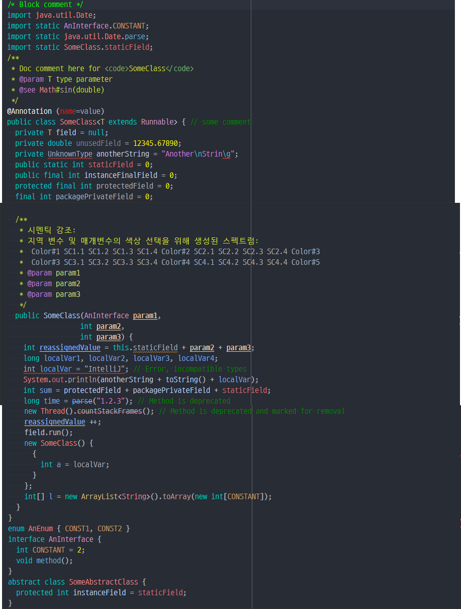 Java 용으로만 맞췄고 Eclipse의 RecognEyes 테마를 좋아해 그걸 유사하게 따왔다.(https://marketplace.eclipse.org/content/darkest-dark-theme-devstyle)